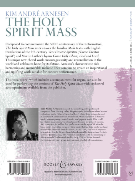 The Holy Spirit Mass interweaves the familiar Mass texts with English translations of the 9th-century Veni Creator Spiritus (‘Come Creator Spirit’) and Martin Luther’s hymn Come Holy Ghost, God and Lord. The work reflects on the long conflict within the church after the religious upheaval of the 16th century. But it also celebrates what the reformation has given us, as well as the ecumenical development and increasing dialogue between the Christian churches. The work looks forward in hope of a more united future by focusing on what we have in common. In this way, the work is both celebratory and reflective, while The Holy Spirit unites us, and gives comfort, strength, inspiration, and excitement.